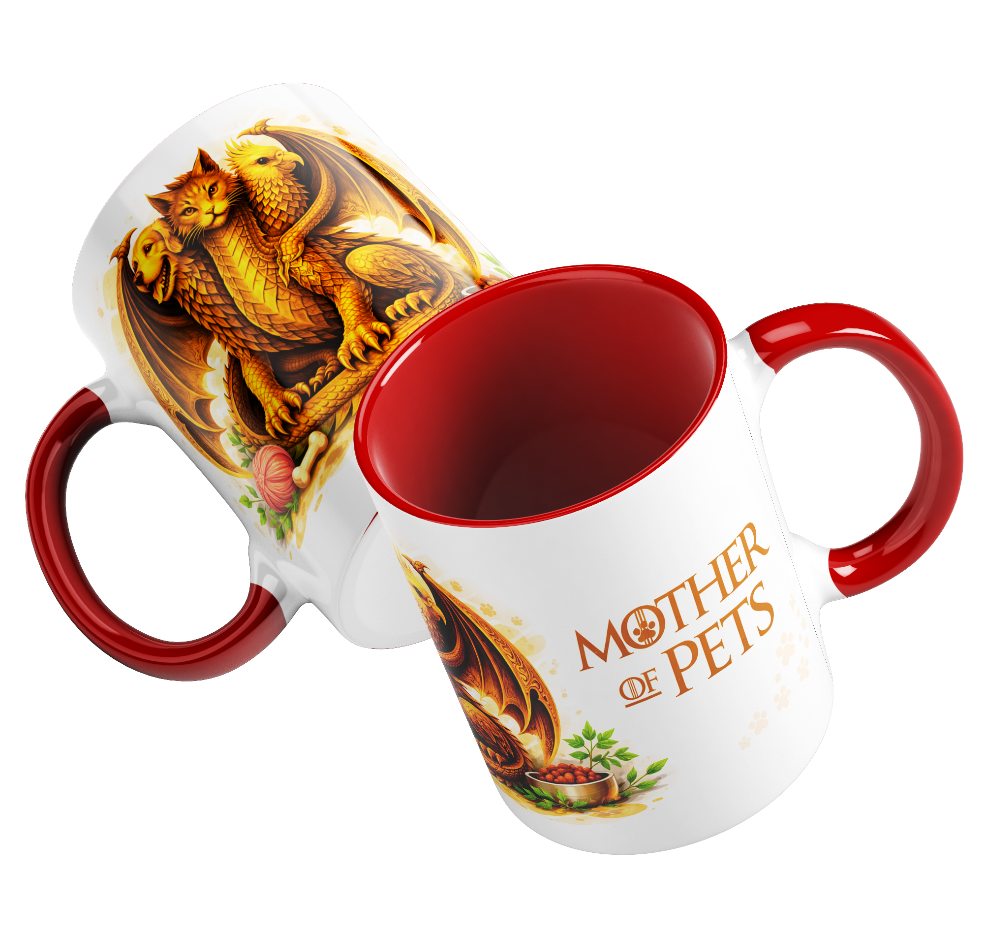 Caneca mãe de pet estilo fantasia medieval, com estampa Mother of Pets inspirada em dragões.